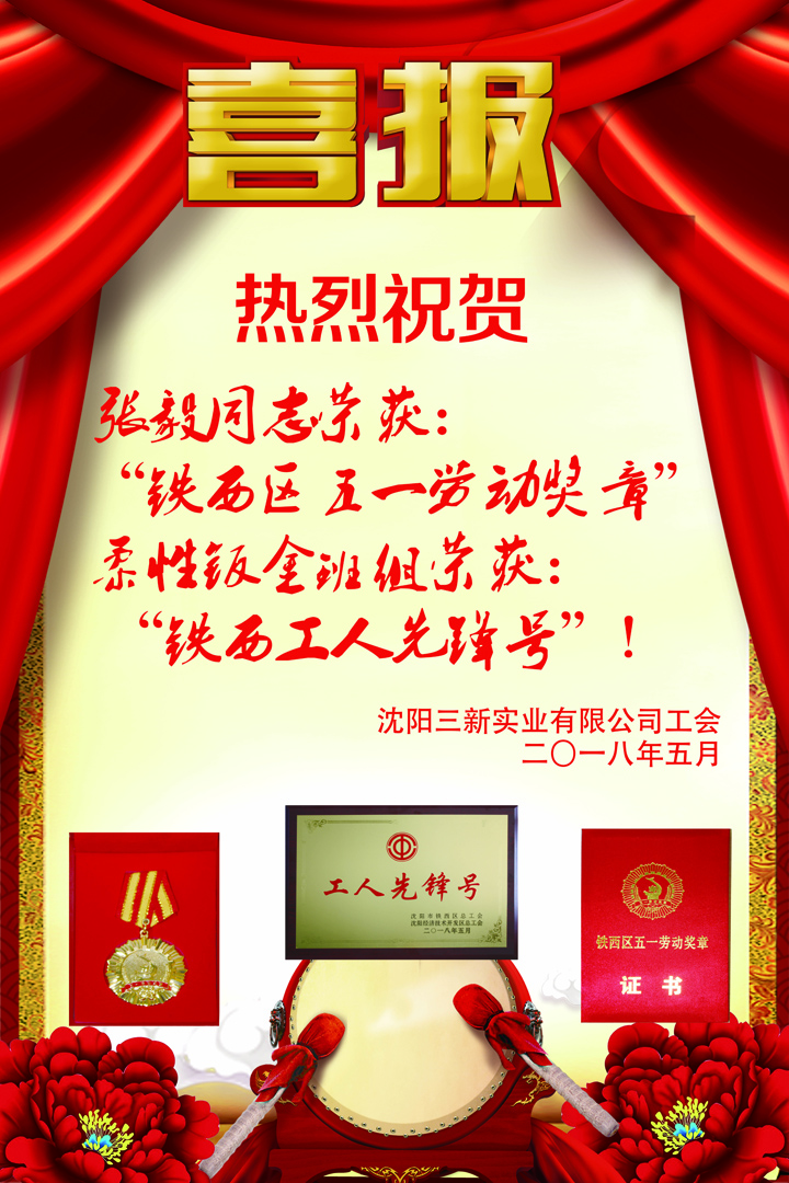 沈陽三新實業(yè)有限公司榮獲“鐵西五一勞動獎狀”,張毅同志榮獲“鐵西區(qū)五一勞動獎章”,柔性鈑金班組于永欣等9名同志榮獲“鐵西工人先鋒號”!