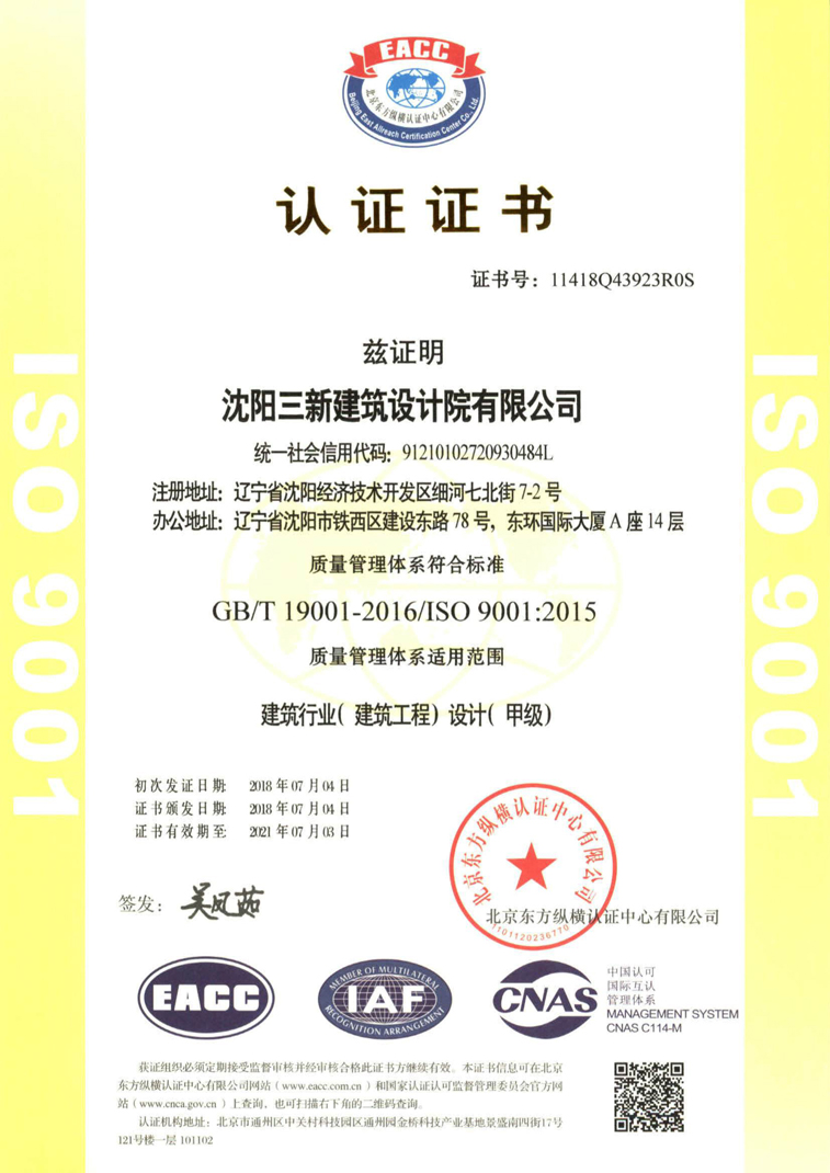 2018年6月28日~29日,北京東方縱橫認證中心對沈陽三新建筑設計院進行質量管理體系認證審核,經過兩天的審核,專家對公司的管理體系運行情況給予好評,滿足標準要求,同時也給出了切實的改進建議。公司組織各部門對審核過程中發(fā)現的不符合進行了總結討論,并針對存在的問題舉一反三,制定并實施整改計劃及預防措施,效果顯著。