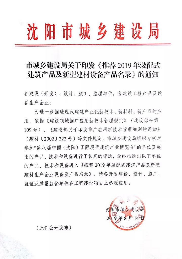 2019年8月14日,沈陽市城鄉(xiāng)建設(shè)局發(fā)布《推薦2019年裝配式建筑產(chǎn)品及新型建材設(shè)備產(chǎn)品名錄》,我公司雙腹扳H型鋼結(jié)構(gòu)梁、箱式集成房、開放式金屬幕墻等產(chǎn)品成功入選。