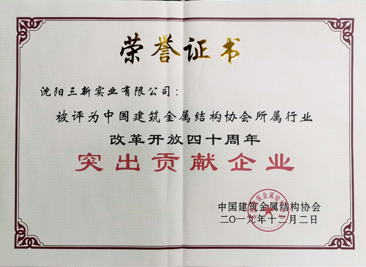 三新集團(tuán)于東云董事長(zhǎng)榮獲“中國(guó)建筑金屬結(jié)構(gòu)協(xié)會(huì)所屬行業(yè)改革開放四十年突出功勛人物”稱號(hào),三新集團(tuán)榮獲“中國(guó)建筑金屬結(jié)構(gòu)協(xié)會(huì)所屬行業(yè)改革開放四十年突出貢獻(xiàn)企業(yè)”稱號(hào)。于東云董事長(zhǎng)被選為中國(guó)建筑金屬結(jié)構(gòu)協(xié)會(huì)第十一屆理事會(huì)名譽(yù)副會(huì)長(zhǎng)。