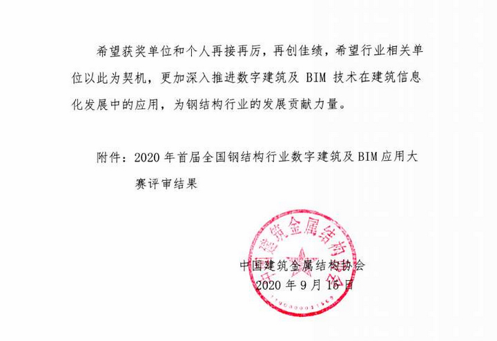 本次大賽由中國(guó)建筑金屬結(jié)構(gòu)協(xié)會(huì)鋼結(jié)構(gòu)分會(huì)承辦,旨在推進(jìn)數(shù)字建筑及BIM技術(shù)在建筑信息化發(fā)展中的應(yīng)用,深化BIM技術(shù)在鋼結(jié)構(gòu)工程中的實(shí)踐,創(chuàng)新BIM專業(yè)技術(shù)人才培養(yǎng)機(jī)制。大賽對(duì)于提高我國(guó)建筑業(yè)建筑信息模型技術(shù)的應(yīng)用水平,實(shí)現(xiàn)真正意義上轉(zhuǎn)型升級(jí),提升工程質(zhì)量和效率、降低造價(jià)和節(jié)約資源,推動(dòng)技術(shù)創(chuàng)新、質(zhì)量創(chuàng)優(yōu)和人才隊(duì)伍建設(shè)有著積極的推進(jìn)作用。同時(shí)相信隨著BIM應(yīng)用的進(jìn)一步展開,我公司的裝配式建筑發(fā)展將如虎添翼,我司 BIM團(tuán)隊(duì)會(huì)取得更加優(yōu)異的成績(jī)!