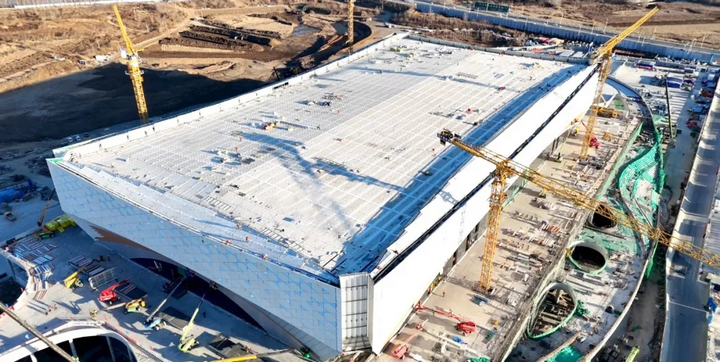 秋碧如洗的渾河之畔,“云上冰玉” 正以出水芙蓉之姿亭亭玉立。這座總建筑面積達(dá) 26.38 萬平方米的冰上巨構(gòu),將 “城市與自然共生” 的理念凝于鋼筋鐵骨,其中 13.57 萬平方米的國家速滑館更以流線型弧面勾勒出渾河的靈動(dòng) —— 空中俯瞰,三新實(shí)業(yè)打造的屋面恰似鎏金鳳冠,在北國陽光下流轉(zhuǎn)著技術(shù)與藝術(shù)交融的光芒。