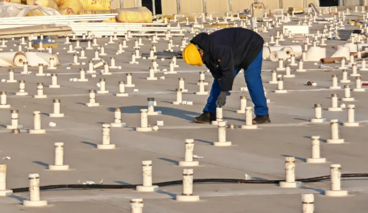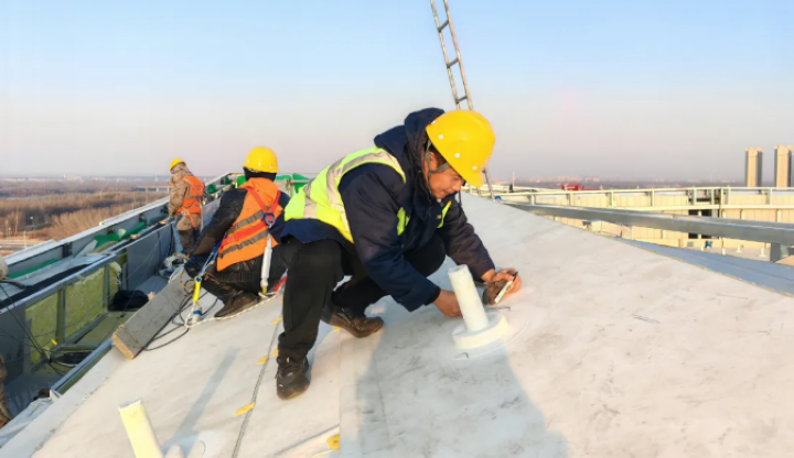 東北的冬季是最大考驗(yàn)。三新專項(xiàng)技術(shù)組優(yōu)化圍護(hù)工藝,攻克低溫TPO 焊接難題;排水天溝內(nèi)置精準(zhǔn)電伴熱系統(tǒng),杜絕凍堵風(fēng)險(xiǎn);光伏支架立桿采用高分子包封件,實(shí)現(xiàn)防水與發(fā)電的無縫銜接。當(dāng)抗風(fēng)揭試驗(yàn)室的模擬狂風(fēng)掠過屋面,這頂 “鳳冠” 用數(shù)據(jù)證明:它不僅是建筑的外衣,更是自然的摯友。