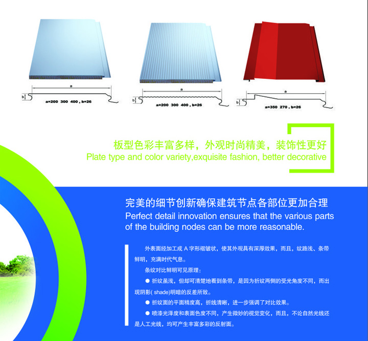 SX-400幕墻板創(chuàng)新的節(jié)點結(jié)構(gòu),獨特的安裝方式,確保外墻的墻面、墻角全無釘。使用三新工業(yè)金屬幕墻板建筑外墻,整潔、美觀,可以達到理想的建筑表面裝飾效果??茖W嚴謹?shù)捻椖抗芾砉ぷ魇谴_保工程安裝能真實地符合三新集團金屬建筑系統(tǒng)技術(shù)體系要求的根本保障。